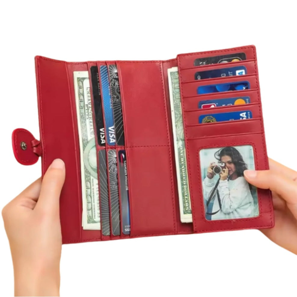 Gran Capacidad: Cuenta con 12 ranuras para tarjetas, 1 para fotografías, 2 compartimentos para recibos, 1 compartimento oculto, 1 bolsillo con cremallera y espacio para tu teléfono móvil.