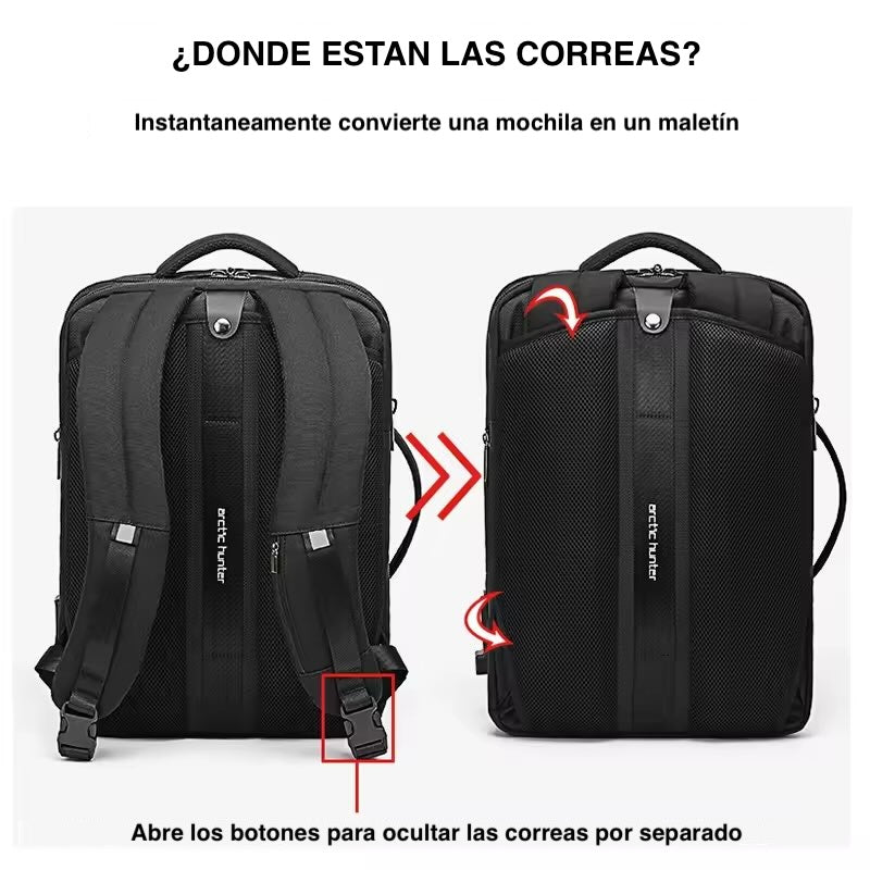 - Cambia de modo mochila a maleta gracias a sus dos asas: superior y lateral.
